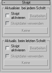 In diesem Rollout können Sie wahlweise bei jedem Integrationsschritt oder nach dem letzten Integrationsschritt jedes angezeigten Frames ein Skript auf das Partikelsystem anwenden. Mit einem Skript für die Aktualisierung bei jedem Schritt können Sie verlaufsabhängige Eigenschaften festlegen, mit einem Skript für die Aktualisierung nach dem letzten Schritt verlaufsunabhängige Eigenschaften.