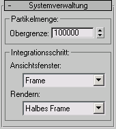 Mit den Einstellungen in diesem Rollout können Sie die Anzahl der Partikel im System beschränken und festlegen, in welchen Abständen das System aktualisiert werden soll.