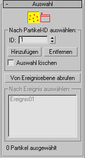 Jedes Partikel verfügt über eine eindeutige ID-Nummer, wobei das erste Partikel die ID 1 erhält und alle weiteren Partikel fortlaufend nummeriert werden. Mit den Steuerelementen in diesem Bereich können Sie Partikel nach ihren ID-Nummern auswählen bzw. ihre Auswahl aufheben. Die Steuerelemente sind nur beim Auswählen auf Partikelebene verfügbar.