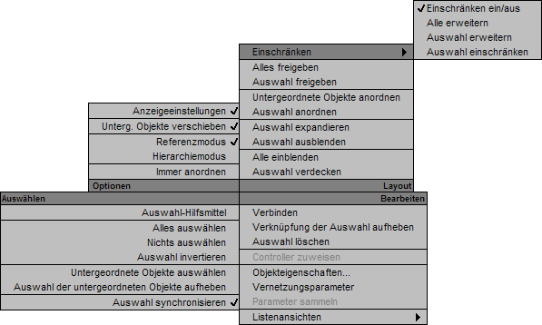 Hebt die Auswahl der untergeordneten Elemente von derzeit ausgewählten übergeordneten Objekten auf. Es müssen das über- und untergeordnete Objekt ausgewählt werden, um die Auswahl des untergeordneten Objekts aufzuheben.
