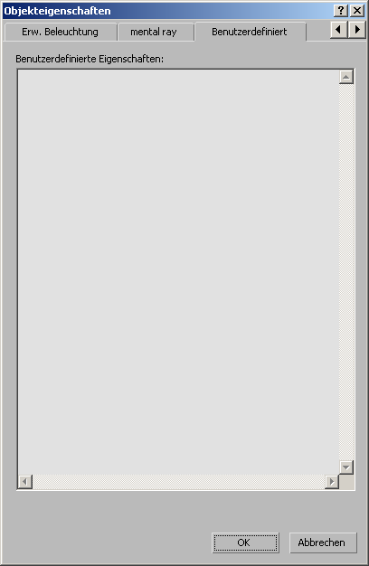 In diesem Textfeld können Sie Eigenschaften für das Objekt oder Kommentare darüber eingeben, die Sie selbst definieren. 3ds Max verwendet diese Eigenschaften nicht, speichert sie jedoch zusammen mit der Szene, weshalb sie immer angezeigt werden, wenn Sie das Dialogfeld mit den Objekteigenschaften für das jeweilige Objekt aufrufen.