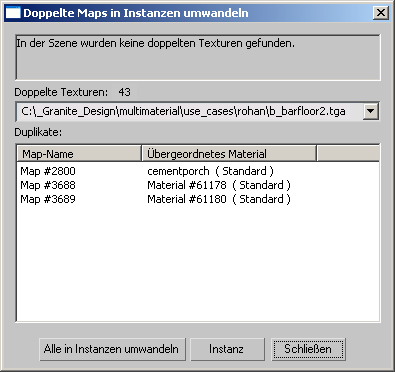 Das Dialogfeld enthält eine Liste aller Textur-Maps, die über exakte Duplikate in der Szene verfügen. Bei der Suche werden alle Kopien eingeschlossen, die über dieselben Pfade und Einstellungen verfügen.