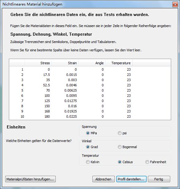 Wenn Sie sich für die Option entscheiden, selbst die nichtlinearen Daten zu spezifizieren, müssen Sie sie in der Reihenfolge Spannung, Dehnung, Winkel und Temperatur durch Semikolon, Doppelpunkt oder Tabulatorzeichen getrennt eingeben. Gehen Sie dabei wie folgt vor: