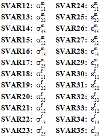 Bei einer progressiven Ermüdungsanalyse mit gewebten Materialien werden SVAR11 bis SVAR94 verwendet, um die einzelnen Komponenten der Durchschnittsspannungs- und -dehnungszustände in der unterschiedlichen Superkonstituenten und Konstituenten zu speichern (was SVAR7 bis SVAR90 bei statischen Analysen entspricht).