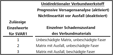 Bei unidirektionalen Verbundmaterialien haben die Zustandsvariablen SVAR2, SVAR3, ..., SVAR35 folgende Bedeutung für statische progressive Schadensanalysen: