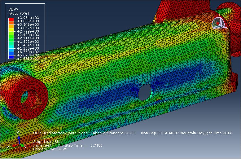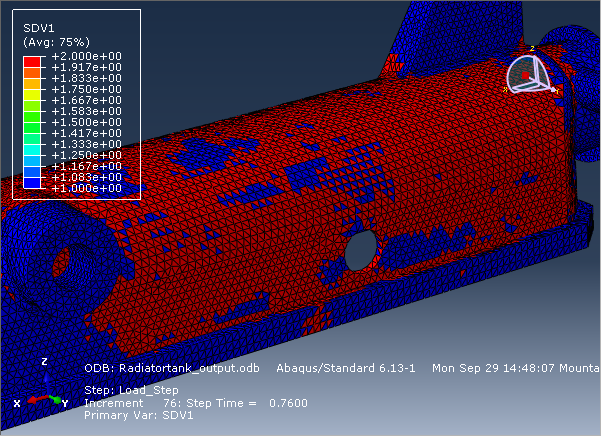 - Überwachen Sie SDV1 von Zeitschritt = 0.74 bis 0.76, um die Progression der Ausfälle zu verfolgen. Da der Heizkörpertank bei jedem Inkrement mit steigendem Druck belastet wird, kann der Ausfall sehr schnell auftreten. Sie können bei Zeitschritt = 0.76 feststellen, dass der Tank vollständig ausgefallen ist.