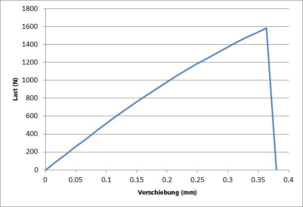 Die Darstellung der Last-Verschiebungskurve zeigt eine endgültige Last von fast 1600 N. Der endgültige schwerwiegende Ausfall tritt bei einer Verschiebung von ungefähr 0.37 mm zwischen Schrittzeit = 0.22 und 0.23 auf. Mit diesen Informationen kann man den schwerwiegenden Ausfall zur Konturendarstellung von SDV1 in Beziehung setzen.