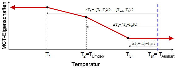Die Gleichungen 32 und 33 werden auch während des MCT-Materialcharakterisierungsprozesses für Verbundmaterialien verwendet, die bei mehreren Temperaturen definiert werden. Die folgende Abbildung zeigt einen typischen Fall, in dem ein temperaturabhängiges Verbundmaterial bei den drei unterschiedlichen Temperaturen T1, T2 und T3 definiert wurde, wobei T1<Tamb, T2=Tamb und Tamb<T3<Tcure. Die Abbildung zeigt außerdem die Temperaturänderung ΔT (berechnete mithilfe der Gleichung 33), die in der mikromechanischen Analyse des Verbundmaterials bei jeder der drei Temperaturen während des MCT-Charakterisierungsprozesses eingeschlossen ist. Bei der Charakterisierung haben diese festgelegten Temperaturänderungen Einfluss auf die Bestimmung der Konstituentenausfallkoeffizienten. Wenn beispielsweise das mikromechanische Modell mechanisch bis zu einem gemessenen Ausfalllastniveau belastet wird, enthält der Ausfallspannungszustand in den Konstituentenmaterialien Anteile der mechanischen Last und der festgelegten Temperaturänderung.