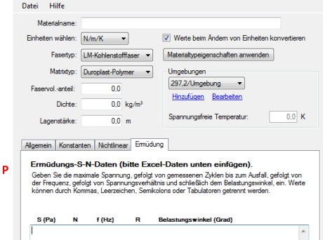 Wenn das gewebte Material, das erstellt wird, für eine Ermüdungsanalyse verwendet werden soll, müssen Ermüdungsdaten auf der Registerkarte "Ermüdung" eingegeben werden.