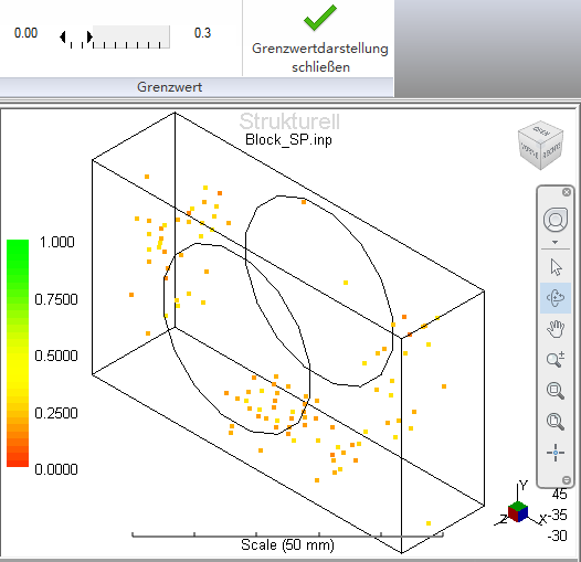 Ziehen Sie die Pfeile auf der Grenzwertskala, um den Bereich der in der Darstellung sichtbaren Gaußschen Punkte zu steuern. Beispiel: Ziehen Sie den Pfeil auf der rechten Seite der Skala auf 0.3 zum Anzeigen der Positionen der Gaußschen Punkte im Modell, die möglicherweise weitere Verfeinerungen benötigen.