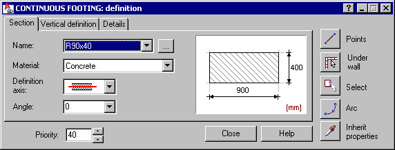 Use the tabs on the Continuous Footing: definition dialog to define parameters: