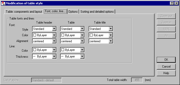 On the Font, color, line tab of the Definition/modification of a table style dialog, you can define the display parameters for a table font.