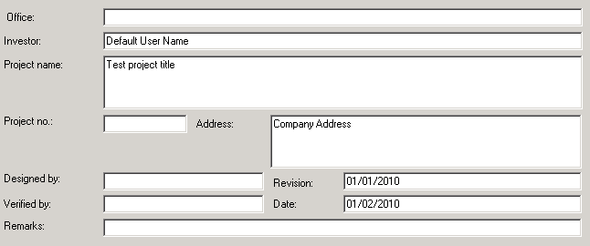 Use the edit fields to enter general information about the project. These fields correspond to the variables used in cells of tables included in drawings and in printout headers: