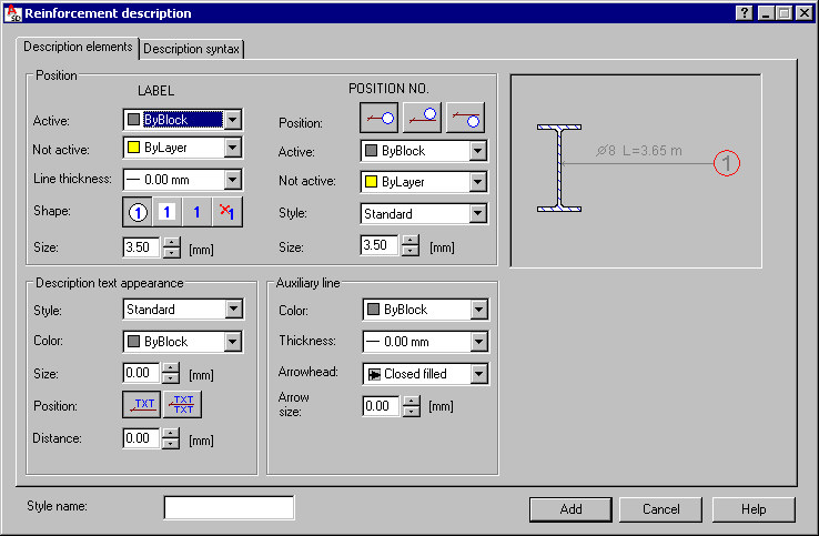 On the Description elements tab of the Reinforcement description (steel profiles) dialog, you can define parameters such as colors, line thickness, font size, and label shape for a description.