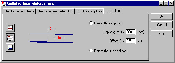 Use this option to define reinforcement laps (connections of reinforcing bars) if a reinforcement length exceeds the value defined in the preferences (e.g. 12 000 mm). After selecting the Lap splice tab, the Reinforcement: definition and detailing - radial reinforcement dialog displays: