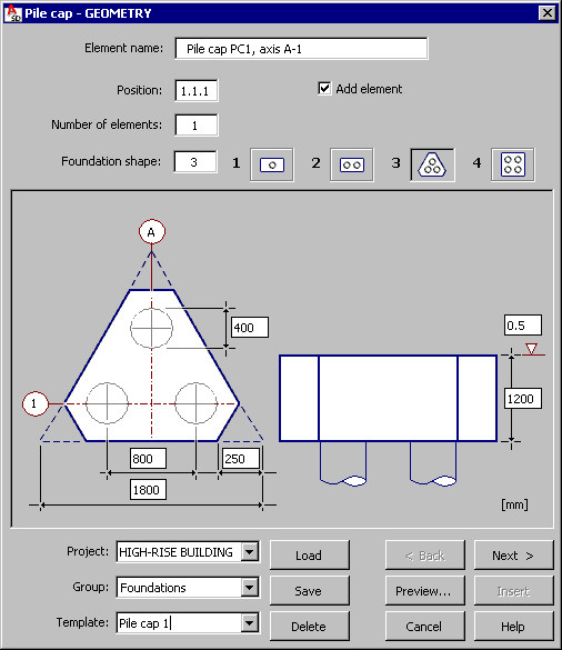 Once pile cap geometry is selected, dimension values are defined; a number of dimensions to be defined depends on a selected pile cap scheme. A schematic drawing of a pile cap adapts itself to the selected scheme.