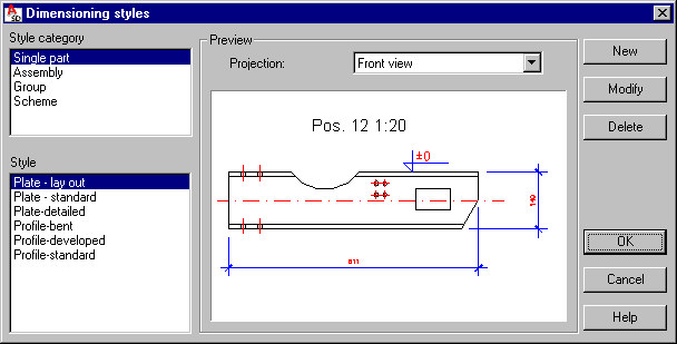You can define any number of dimensioning styles. Each defined style belongs to one of the categories concerning the type of a drawing position (single part, assembly, group, scheme - a group of elements constituting a structure model).