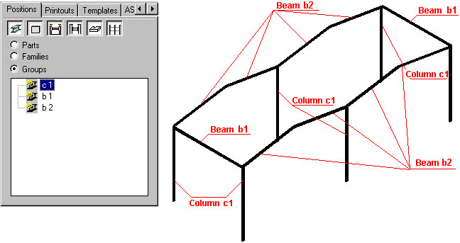 All elements of the 3D frame will be assigned positions according to the parameters specified in the Automatic positioning dialog. Because some frame elements are identical, 3 positions will be created on the Positions tab of the Object inspector dialog: columns c, beams b1, and beams b2. The drawing below illustrates the created positions and location of the structure elements that make up individual positions.