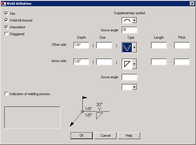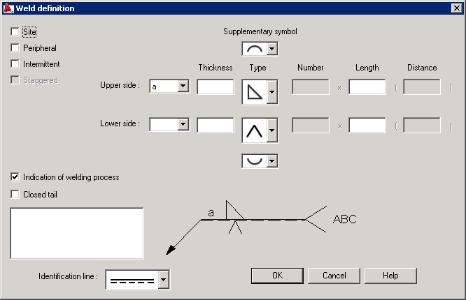 Options in this dialog allow inserting weld symbols and describing welds in drawings according to the requirements of the European codes such as BS, DIN and ISO.