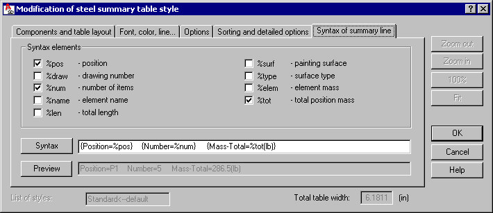 The image below displays the Syntax of summary line tab of the Definition/Modification of steel summary table style dialog.