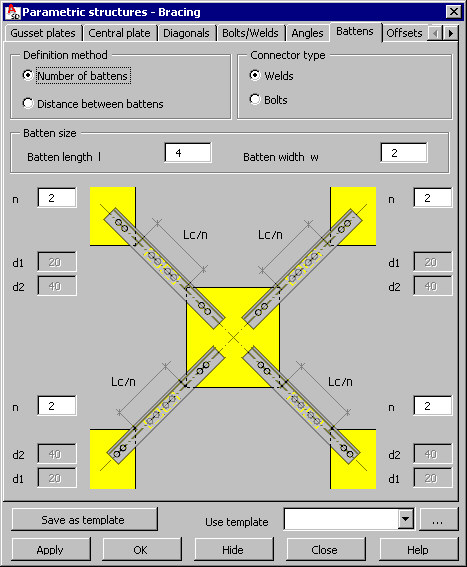 If Battens is selected on the Diagonals tab of the Bracing dialog, the Battens tab will be accessible. Use the options on this tab to define parameters of battens between the legs of diagonal profiles.
