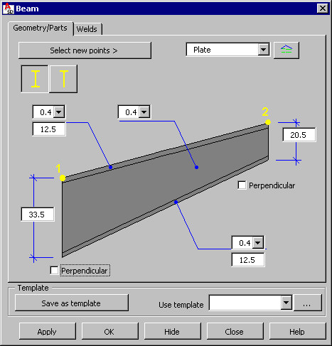 - Web height at the beginning and at the end of the plate girder (the definition method depends on the Perpendicular options).