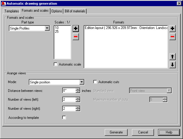 On the Formats and scales tab of the Automatic drawing generation dialog, you can define scales, formats, and views for an option (object) selected in the Part type field.