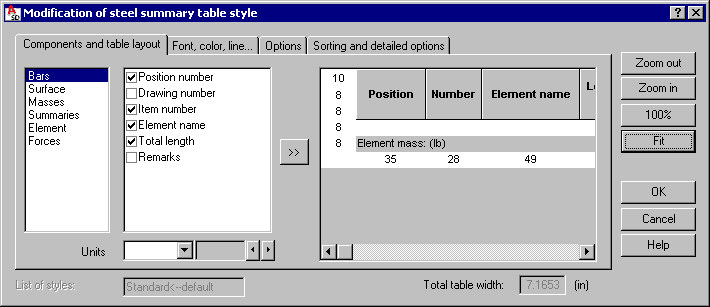 Note: The options on this tab depend on a table type selected in the Steel summary tables - style manager dialog. The example above displays the options available after selecting the element list.