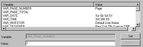 VAR_PAGE_NUMBER - lets you assign a current printout page. If VAR_PAGE_TOTAL is used, text assigned to the variable will precede the total number of pages (for example, Page 1, Page 2, and so on)