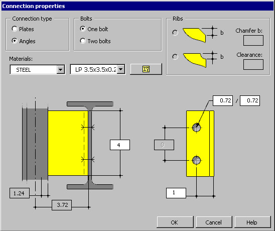 Use the dialog to define the connection type (plates or angles) and to determine the number of connectors (1 bolt or 2 bolts). You can define the profile type and the material of which the connection will be made. Profiles available on the selection list are those defined in the Profile List dialog. To add a profile to the list, click