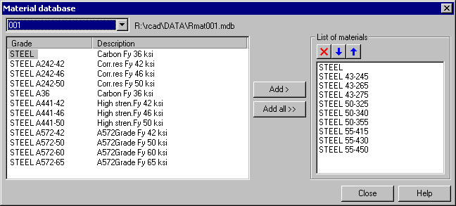In the dialog, you can add materials from databases accessible in the program to the list of available materials. To add a material to the list: