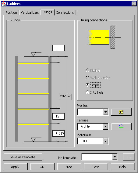 Use the options on the Rungs tab to define data concerned with ladder rungs: profile type, family type, and material.
