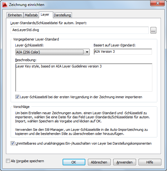 Die Layer-Einstellungen im Dialogfeld Zeichnung einrichten. Beachten Sie, dass der automatische Import eines Layer-Schlüsselstils festgelegt ist, und dass Als Vorgabe speichern aktiviert ist. Dadurch wird sichergestellt, dass der korrekte Layer-Schlüsselstil auch dann geladen wird, wenn Sie eine Zeichnung ohne Vorlage beginnen. Beachten Sie ebenfalls, dass die Option Layer-Schlüsselstil bei der ersten Verwendung in der Zeichnung immer importieren ebenfalls aktiviert ist. Dies ist eine Zeichnungseinstellung und sollte in der Vorlage festgelegt sein. Dadurch wird sichergestellt, dass der aktuelle Layer-Schlüsselstil auch in Zeichnungen verwendet wird, die bereits bearbeitet werden.