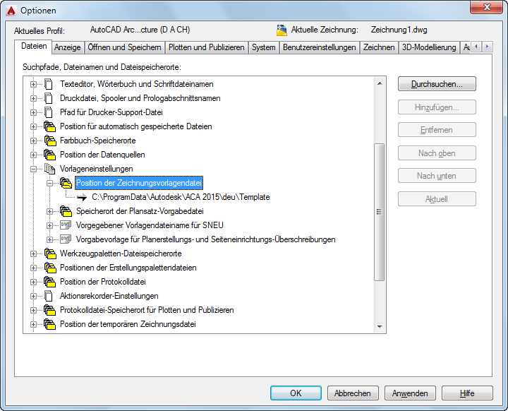- Layer-Schlüsselstile und Layer-Standards: Diese Inhalte können zwar in einer Vorlage gespeichert werden, es ist jedoch empfehlenswert, sie stattdessen in einer Bibliothekszeichnung aufzubewahren. Im Dialogfeld Zeichnung einrichten können Sie sicherstellen, dass in neue Zeichnungen und Zeichnungen, die sich bereits in Bearbeitung befinden, beim Öffnen stets automatisch der aktuelle Layer-Schlüsselstil importiert wird. Sie arbeiten dann immer mit der aktuellen Version.