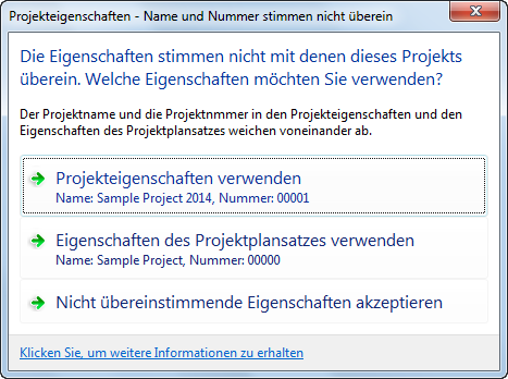 Wenn der Projektname und die Projektnummer im Projekt und in der Plansatzvorlage nicht übereinstimmen, wird eine Meldung angezeigt: