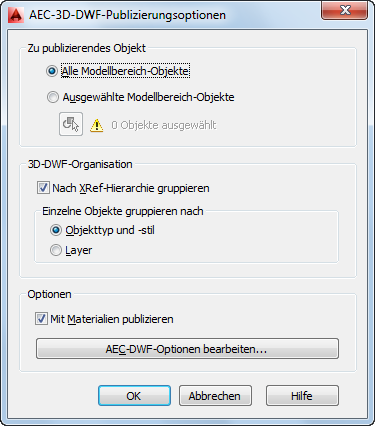 | Gruppieren der Objekte nach Layer | Deaktivieren Sie Nach XRef-Hierarchie gruppieren. Wählen Sie unter Einzelne Objekte gruppieren nach die Option Layer. |
