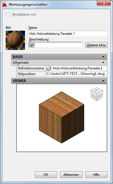 Das Materialwerkzeug wird jetzt in der Palette durch das Würfelsymbol von AutoCAD Architecture mit der gewünschten Materialdarstellung angezeigt.