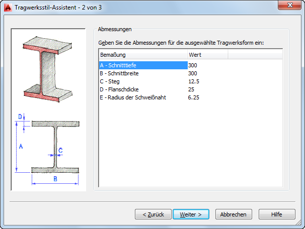 Gehen Sie wie folgt vor, um einen Tragwerksstil über den Tragwerksstil-Assistenten zu erstellen. Sie können innerhalb des Stils eine Tragwerksform erstellen, die auf eine der 19 verschiedenen Formen im Tragwerkskatalog basiert. Die aktuellen Zeichnungseinheiten legen die Einheiten des Stils fest, den Sie erstellen.
