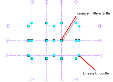In einem erweiterten benutzerspezifischen Stützenraster befinden sich Griffe in der Mitte und an den Enden jeder Rasterlinie. Bewegen Sie diese Griffe, um das erweiterte benutzerspezifische Stützenraster zu bearbeiten.