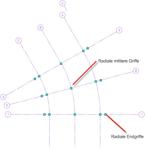 Bearbeiten von radialen erweiterten benutzerspezifischen Stützenrastern mit Griffen
