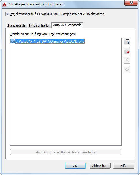 8. Wenn Sie im Abschnitt zum Einrichten von Standardstilen und Darstellungseinstellungen DWS-Dateien als AEC-Standards eingerichtet haben, können Sie diese für die AutoCAD-Standards wiederverwenden. Klicken Sie dazu auf DWS-Dateien aus Standardstilen hinzufügen. Dadurch werden die AEC-Standardsdateien auf die Registerkarte AutoCAD-Standards kopiert und im Projekt als AutoCAD-Standarddateien verwendet.