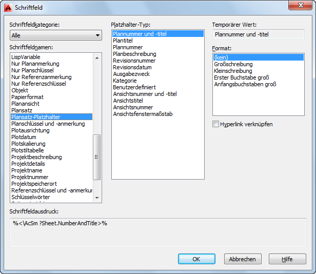 Tipp: Die Kategorie Plansatz enthält Felder für Ansichten und Pläne.