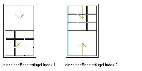 | zu einer einzelnen Flügelkomponente | Wählen Sie unter Fensterfläche die Option Weitere. Wählen Sie Einzeln, und geben Sie die Indexnummer für den Fensterschieberahmen an. Die Fensterflügel sind beginnend in der unteren linken Ecke gegen den Uhrzeigersinn indiziert. |