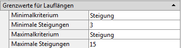 Angeben einer minimalen Anzahl für die Stufen pro Treppenlauf | Wählen Sie Steigungen für Minimaler Grenzwerttyp, und geben Sie die minimale Anzahl der Stufen ein. |