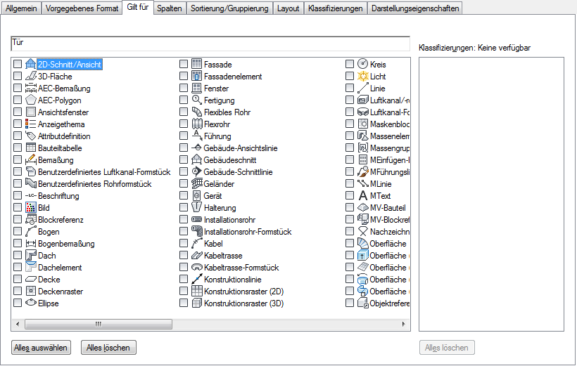 Im rechten Fensterbereich werden alle Klassifizierungsdefinitionen aufgeführt, die für die ausgewählten Objekttypen gelten. Sie können mehrere Klassifizierungen in mehreren Klassifizierungsdefinitionen auswählen. Wenn Klassifizierungen ausgewählt werden, können Bauteiltabellen dieses Stils nur dann im linken Fensterbereich ausgewählte Objekte enthalten, wenn diese anhand der ausgewählten Klassifizierungen klassifiziert wurden.