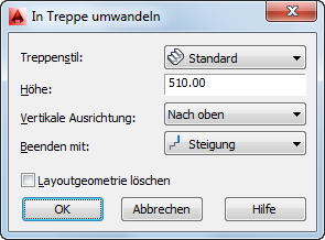 8. Überprüfen Sie im Dialogfeld In Treppe umwandeln die Werte der Parameter Stil, Höhe, Vertikale Ausrichtung und Beenden mit bzw. ändern Sie sie. Geben Sie an, ob die Layoutgeometrie gelöscht werden soll, und klicken Sie dann auf OK.