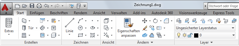 AutoCAD Architecture verfügt über einen einzigen Vorgabe-Arbeitsbereich (Architektur). Die Menüs und Befehle der früheren Arbeitsbereiche (Gestaltung, Ausarbeiten, Detaillieren und Visualisieren) können über die Registerkarten der Multifunktionsleiste aufgerufen werden.