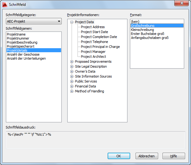 Unter Schriftfeldnamen werden alle projektbezogenen Felder angezeigt.