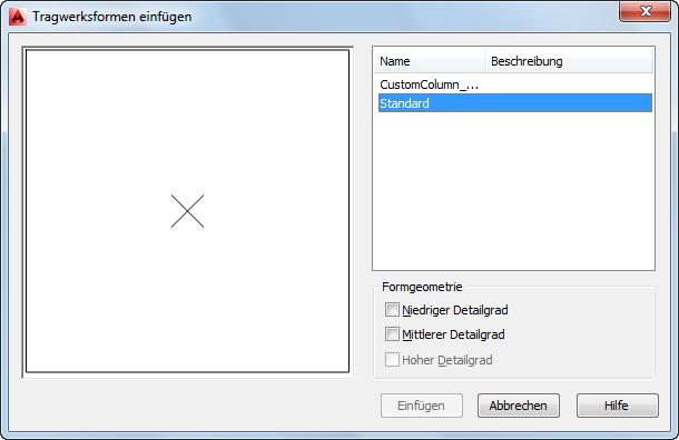 Gehen Sie wie folgt vor, um eine oder mehrere Geometrien in eine Zeichnung einzufügen, die für eine benutzerdefinierte Form definiert wurden. Die Geometrie kann dann bearbeitet oder wie erstellt in einer der Darstellungen für andere benutzerdefinierte Tragwerksformen, die Sie erstellen oder bearbeiten, verwendet werden.