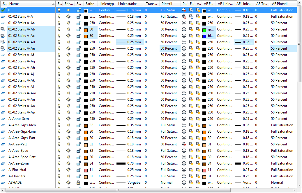 Überschreibungen für Farbe, Linientyp, Linienstärke und Plotstil können nun auf Layer in einzelnen Layout-Ansichtsfenstern angewendet werden. Dies ist eine praktische Möglichkeit zum Anzeigen von Objekten mit verschiedenen Eigenschaftseinstellungen in einzelnen Layout-Ansichtsfenstern, ohne die Eigenschaften VonLayer oder VonBlock ändern zu müssen. Da die Layer-Eigenschaftsüberschreibungen keine globalen Layer-Eigenschaften ändern, können Sie Objekte in mehreren Ansichtsfenstern auf verschiedene Weise anzeigen, ohne Geometrien mehrfach erstellen oder externe Referenzen mit unterschiedlichen Layer-Einstellungen verwenden zu müssen. Wenn der Layereigenschaften-Manager über eine Layout-Registerkarte geöffnet wird, werden vier zusätzliche Spalten für die ansichtsfensterspezifischen Layer-Eigenschaftsüberschreibungen angezeigt: AF Farbe, AF Linienstärke, AF Linientyp und AF Plotstil (nur in Zeichnungen mit benanntem Plotstil, PSTYLEMODE=1, verfügbar).